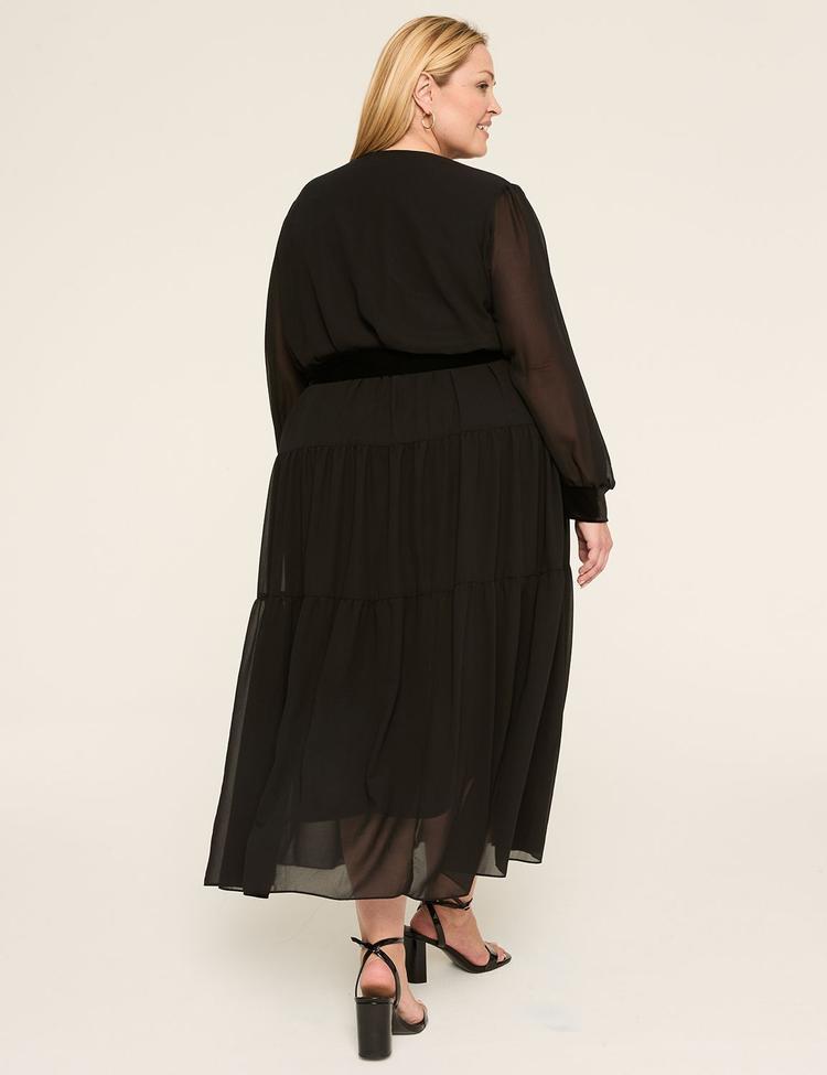 Available in Plus Size Get the party started with this maxi chiffon dress, topped off with royally rich velvet trim. Just add some statement jewelry and you're event ready! FIT: Faux-Wrap. Surplice neck with a self-tie for a customizable, universally flattering fit. Front Length (On Body): 54" Maxi length FEATURES: Surplice neck Long sleeves with cuffs Elastic waist Velvet self-tie belt Lined FABRIC: Soft chiffon with luxe-velvet trim Machine Wash Cold With Like Colors Gentle Cycle Only Non-Chlorine Bleach When Needed Tumble Dry Low Cool Iron If Needed 100% Polyester Item Number #413395 Imported Plus Size Dress ". Plus Size Velvet-Trim Faux-Wrap Maxi Dress, in Black, 18, Women's, Lane Bryant