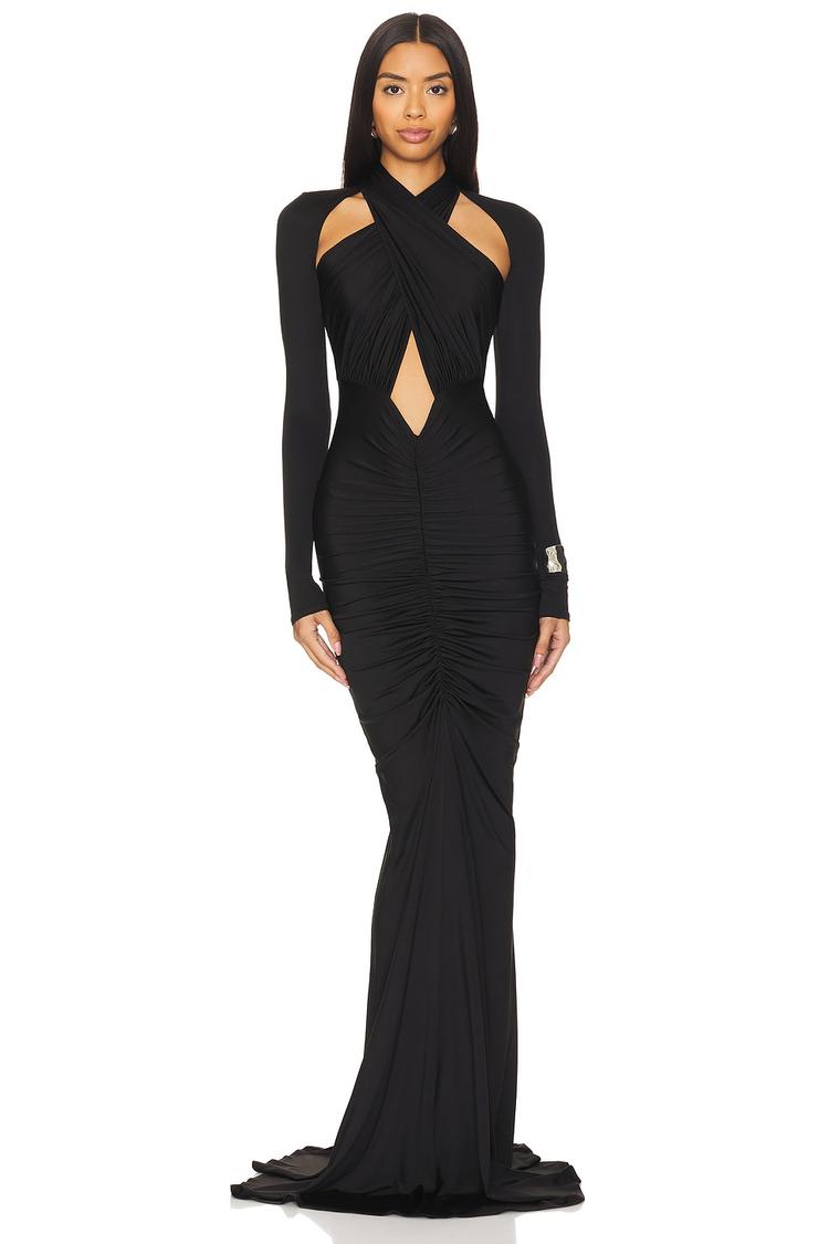 Sleek and figure-hugging, this matte black column gown features a striking halter neckline and long sleeves, perfectly balancing elegance and sex appeal. Intricate ruching cascades throughout the maxi length, creating texture and accentuating curves. Crafted from midweight stretchy jersey fabric with acetate and elastane for comfort and movement, this gown is tailored with a concealed back zipper and a covered back for a smooth finish. Ideal for formal evenings, cocktail parties, or glamorous date nights, it embodies modern sophistication with a confident silhouette.