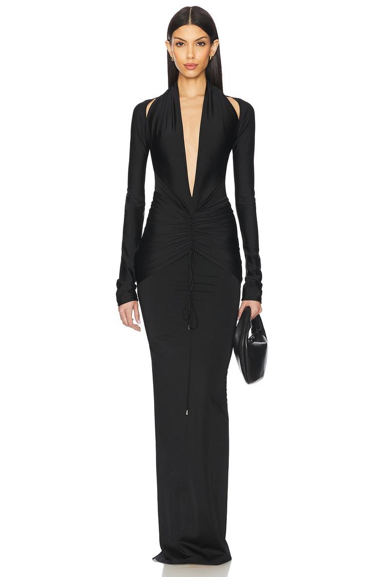 A sleek matte black column silhouette with a daring deep plunge neckline and open back creates a bold statement. Crafted from a midweight high-shine nylon-spandex jersey, this fitted maxi gown features long bolero sleeves with hook and eye clasps and an adjustable draped front drawstring at the waist, enhancing its sexy modern vibe. The clean hemline and smooth fabric lend sophistication, perfect for cocktail parties, date nights, or glamorous evening outings. This gown blends edgy style with elegant detailing, making it a standout choice for confident, fashion-forward occasions.
