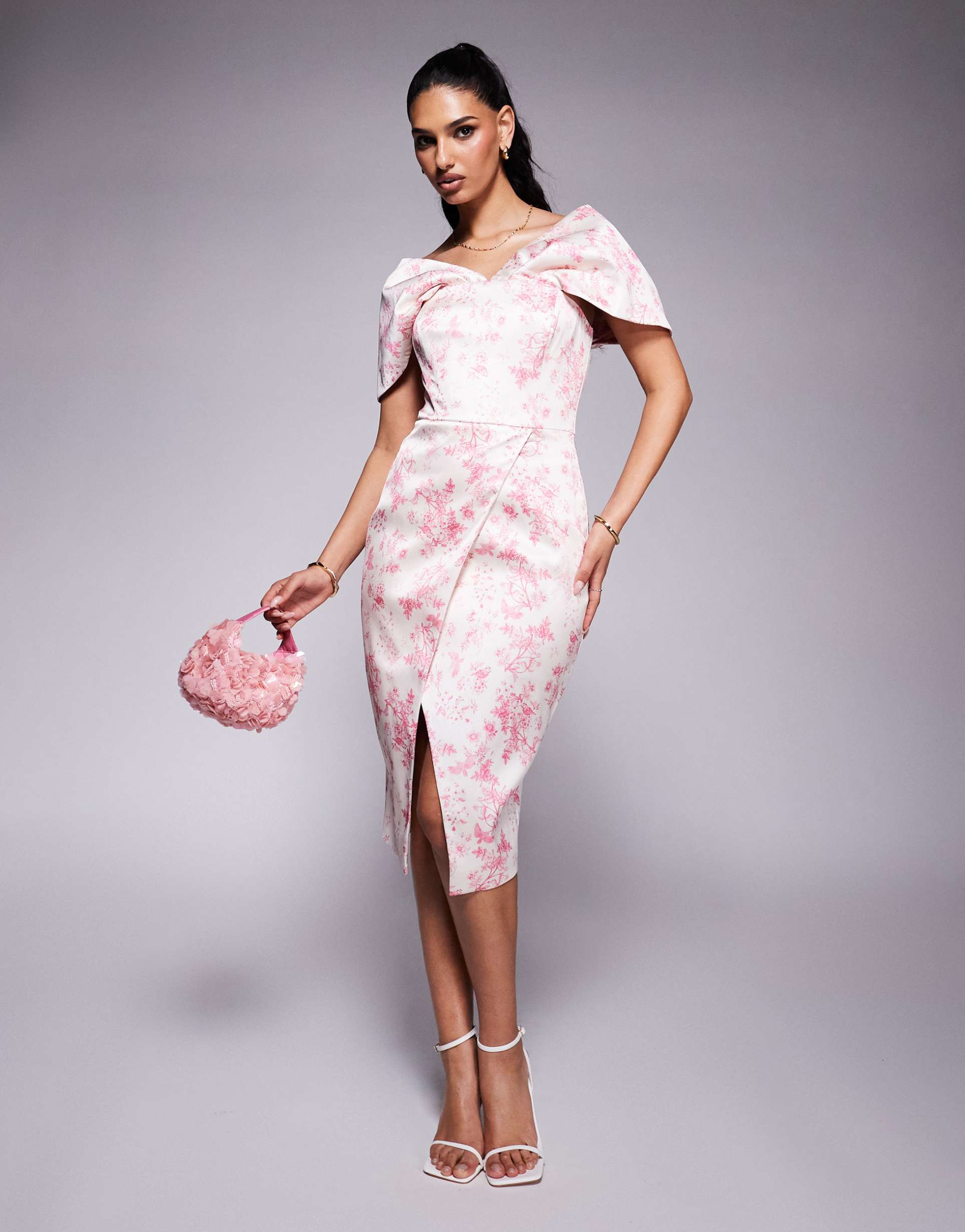 LAVISH ALICE DRAPED BARDOT BONDED SATIN MIDI DRESS IN FUCHSIA PORCELAIN PRINT