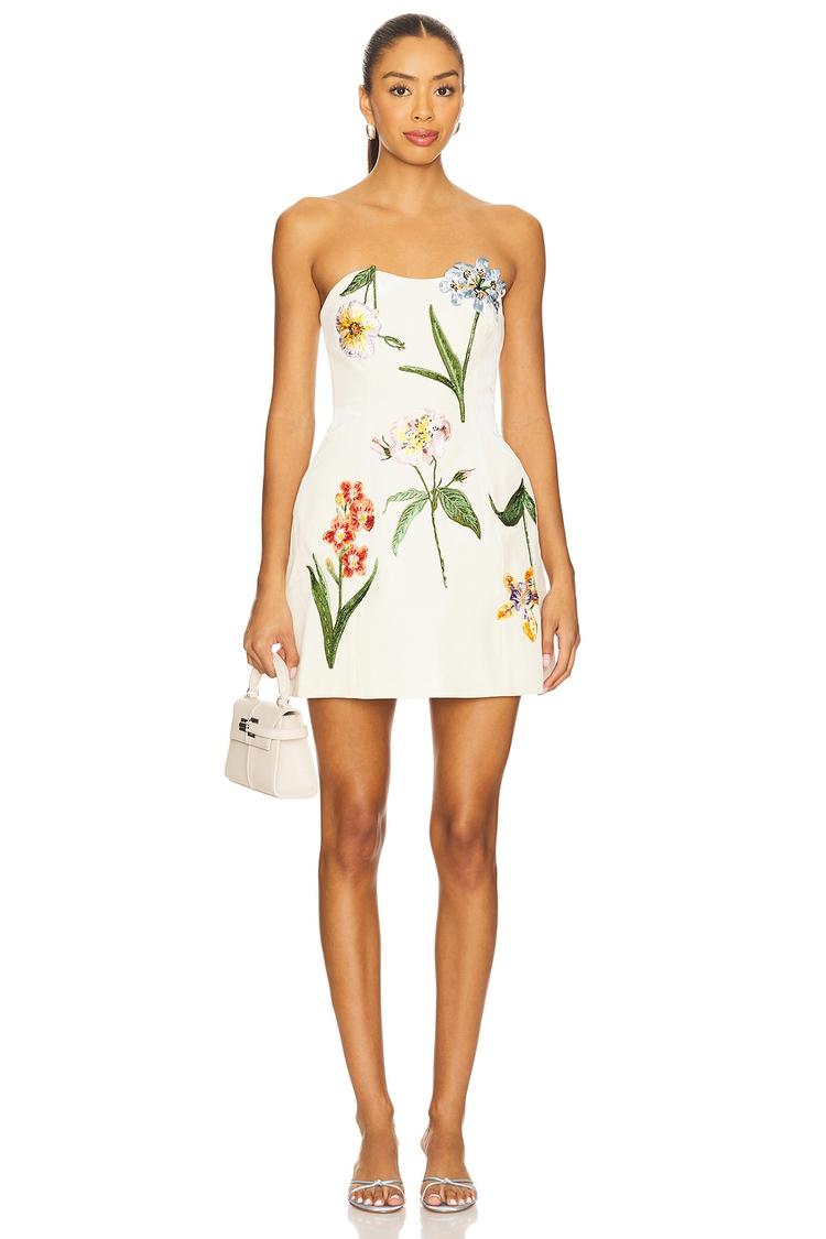 Soft velvet texture and a fitted shift silhouette define this mini dress, featuring a strapless straight neckline and boned bodice for structured elegance. Delicate floral embroidery adorns the front and back, adding a sophisticated touch to its crisp white base. The invisible back zipper ensures a sleek finish. Ideal for autumn and winter cocktail parties, date nights, or evening events, this dress blends refined style with luxurious fabric for a standout statement.