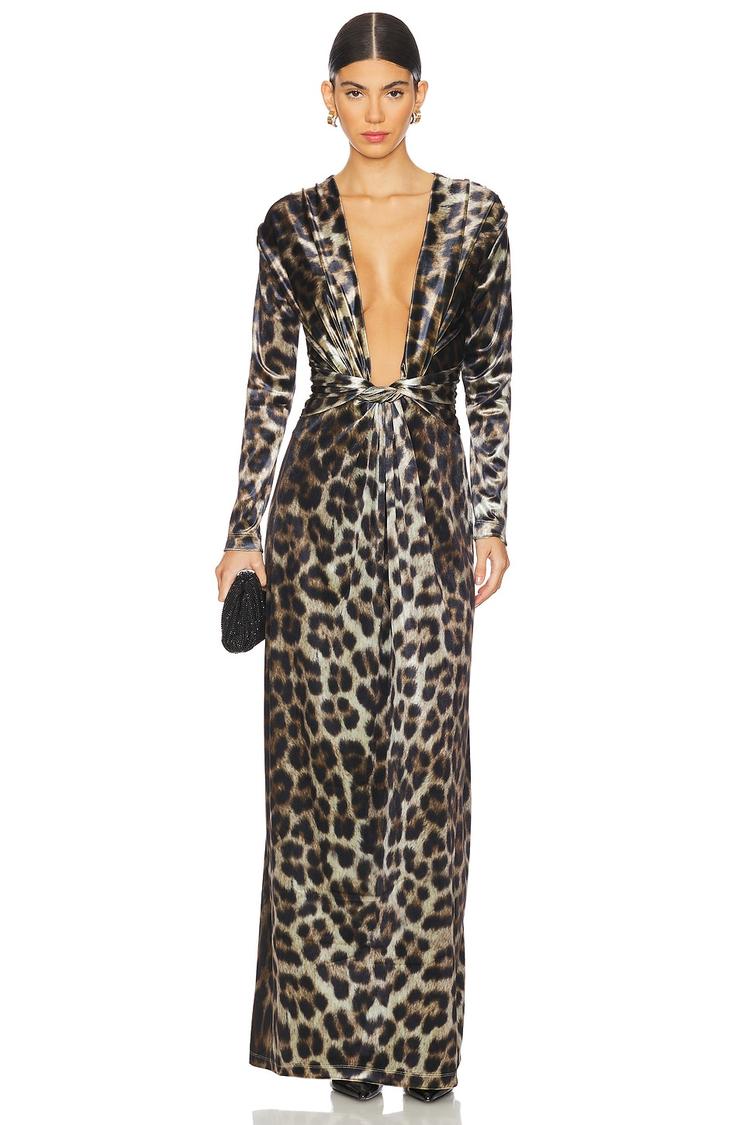 Velvet's rich texture enhances this animal print column maxi dress, featuring a deep scoop neckline with a stylish knot accent that flatters the silhouette. The long sleeves and slim fit create a modern, sexy look, while the open back adds an alluring touch. Perfect for autumn and winter evenings, this piece easily transitions from cocktail parties to intimate date nights and stylish night outs. Crafted from a comfortable polyester-velvet blend with pull-on styling, it offers both elegance and ease for sophisticated occasions.