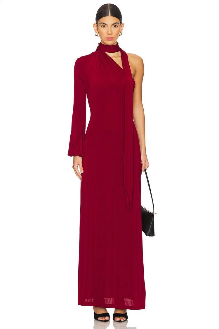 A striking column silhouette in matte burgundy jersey fabric offers a sleek, slim fit that cascades into a clean maxi hemline. The asymmetric neckline paired with an attached scarf detail at the shoulder creates a modern and sophisticated edge, while long sleeves with elastic cuffs add subtle volume and comfort. This elegant pull-on dress features a daring open back and is perfect for formal evenings, cocktail parties, and romantic date nights. Crafted from a slinky blend of polyamide and elastane, it promises both style and ease for all-season wear.