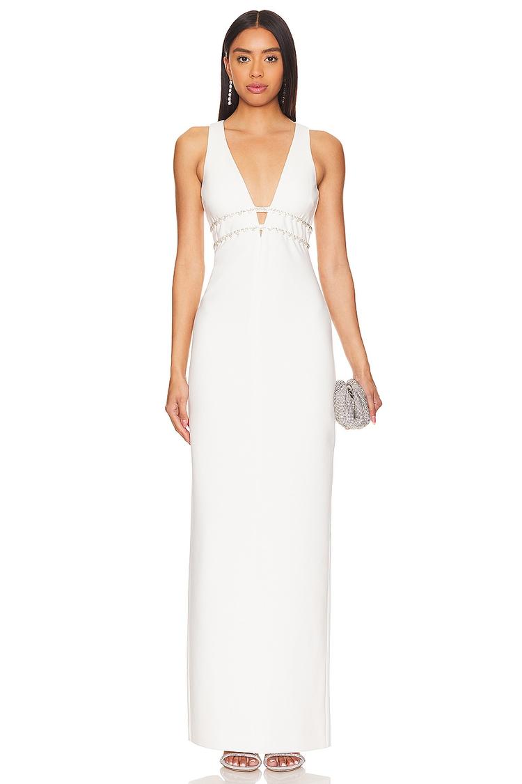 A sleek column silhouette in crisp white crepe fabric defines this elegant maxi gown. The plunging neckline and sleeveless wide straps create a sophisticated profile, while crystal embellishments at the bodice add a touch of refined sparkle. Fully lined with a concealed back zipper and a daring back slit for ease of movement, this fitted gown is perfect for formal occasions, cocktail parties, and wedding guest attire. Its timeless design and luxe fabric blend ensure a polished, graceful look for all-season wear.