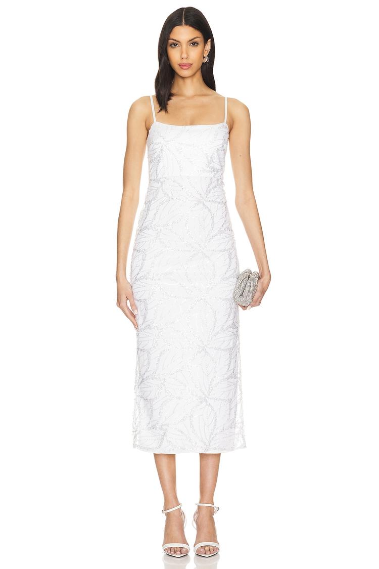 Delicate plisse sequin embellishments shimmer across a fitted sheath silhouette, crafted in smooth polyester fabric. The midi length and square neckline blend sophistication with modern elegance, while adjustable spaghetti straps provide a customizable fit. A hidden back zipper ensures a seamless look. Ideal for cocktail parties, date nights, and upscale evening events, this white dress shines with subtle texture and a clean hemline, making it a versatile and refined choice for spring and summer occasions.