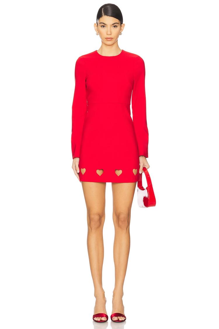 Vibrant red crepe fabric shapes a sleek mini shift dress with a fitted silhouette that flatters the figure. Long regular sleeves balance the playful heart-shaped cutouts at the back and hem, while a concealed back zipper and button closure ensure a smooth finish. The round neckline and elegant design details make this dress perfect for a chic night out, cocktail party, or a romantic date night, offering a modern yet sexy style that suits all seasons.