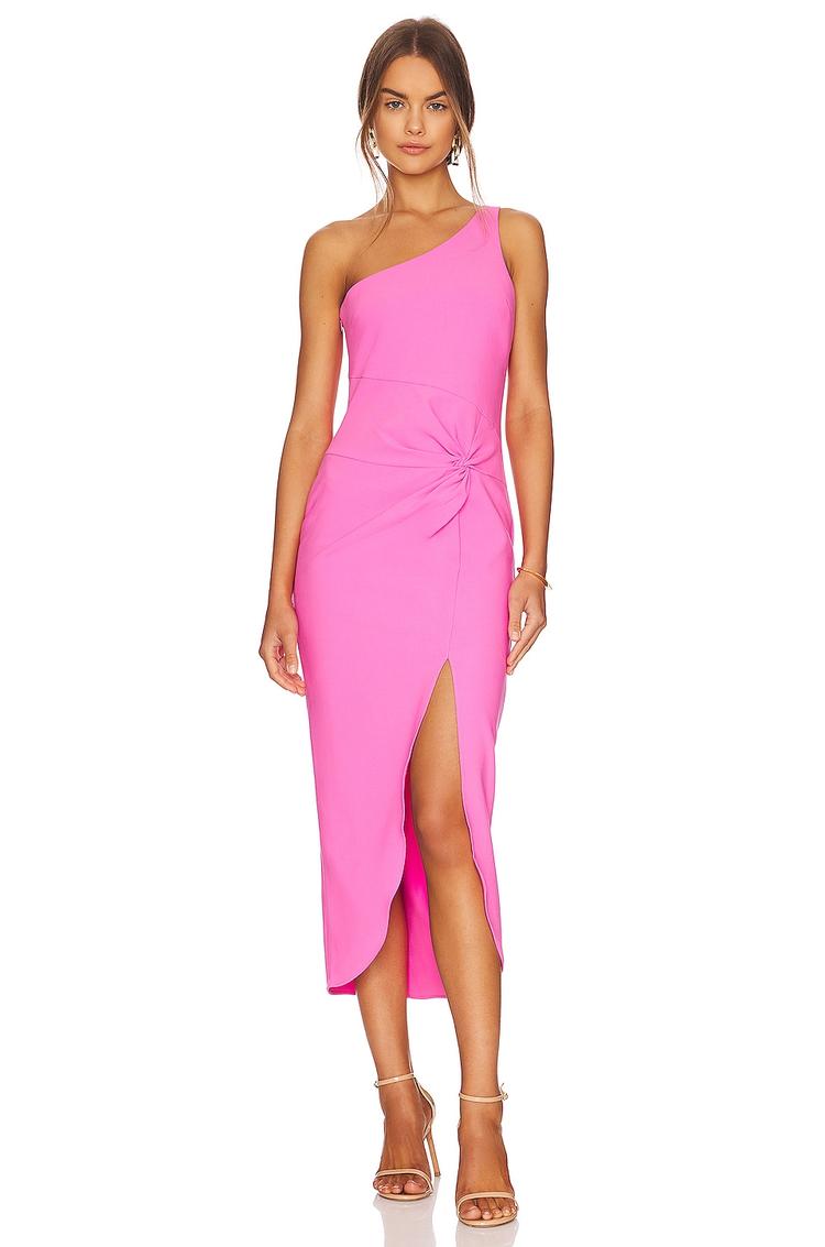 Bright pink crepe fabric forms a sleek, fitted sheath silhouette with an asymmetric neckline and wide straps, creating a modern and elegant look. The midi-length hem features a daring front slit complemented by a twisted drape detail that enhances the dress’s sophisticated charm. Partially lined with a concealed side zipper closure, this piece offers both comfort and style. Ideal for cocktail parties, date nights, or stylish evening outings, this dress blends contemporary chic with feminine allure perfectly.