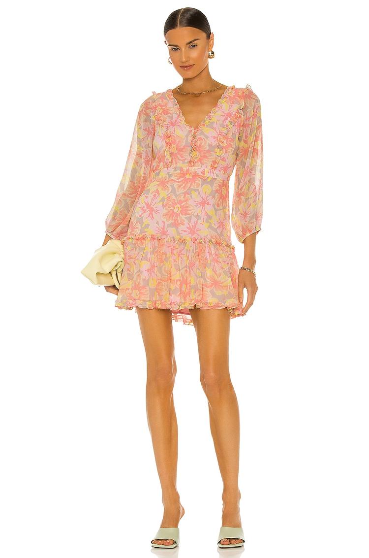 Soft floral patterns and delicate ruffle trims highlight this romantic mini dress crafted from lightweight polyester with elastane for comfort. The V-neckline and three-quarter balloon sleeves add an elegant touch to its regular fit A-line silhouette. Perfect for spring and summer occasions, it suits brunches, date nights, and cocktail events with ease. The concealed back zipper and fully lined design ensure a smooth finish and comfortable wear, while the ruffled hem brings playful movement to this classic, feminine piece.