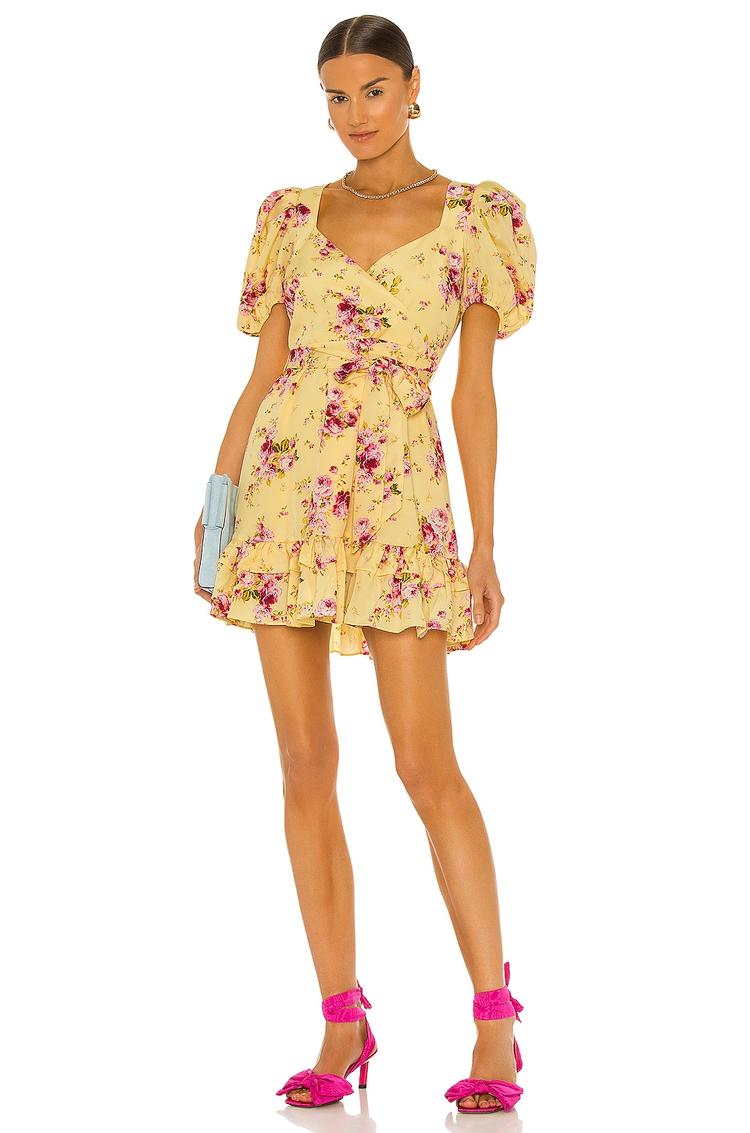 Soft yellow fabric adorned with rich burgundy and pink florals shapes a fitted mini dress with a romantic sweetheart neckline. The puffed half sleeves and ruffled hem add flirty volume, while a detachable waist tie enhances the hourglass silhouette. Crafted from lightweight polyester with stretch elastane, this dress balances comfort with style. Its concealed back zipper ensures smooth closure, making it ideal for spring and summer occasions like brunches, date nights, or cocktail parties. The playful ruffles and floral pattern bring a trendy, youthful vibe to your wardrobe.
