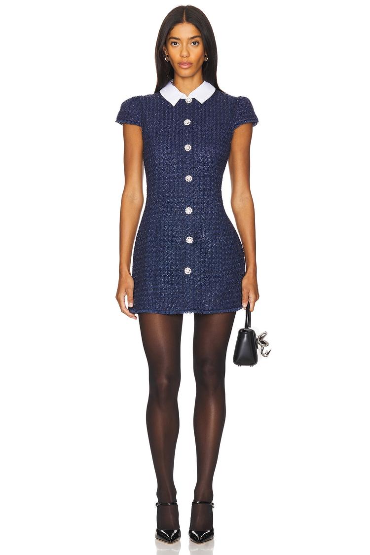 A heavyweight tweed fabric shapes this fitted mini shift dress in a deep matte navy blue, accented by a crisp white Peter Pan collar and short cuffed sleeves. The front features sparkling faux rhinestone buttons that add a touch of sophisticated glamour, while the fringed hem brings subtle texture and movement. Designed with a hidden back zip closure, this dress offers a clean silhouette perfect for business casual or cocktail occasions during the autumn and winter seasons.
