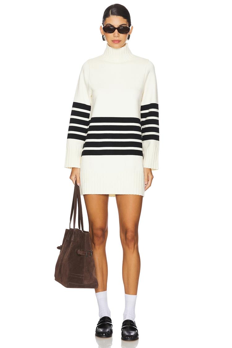 Soft knit fabric and a high neckline define this Abbey Sweater Dress, featuring bold black stripes across a crisp white base for a striking minimalist look. The long sleeves and ribbed details at the cuffs, collar, and hem add texture and classic sweater charm. Its regular fit and mini length make it effortlessly stylish and comfortable for casual autumn and winter days. Ideal for everyday wear, brunch dates, or casual outings, this pull-on sweater dress blends cozy warmth with clean lines and modern simplicity.