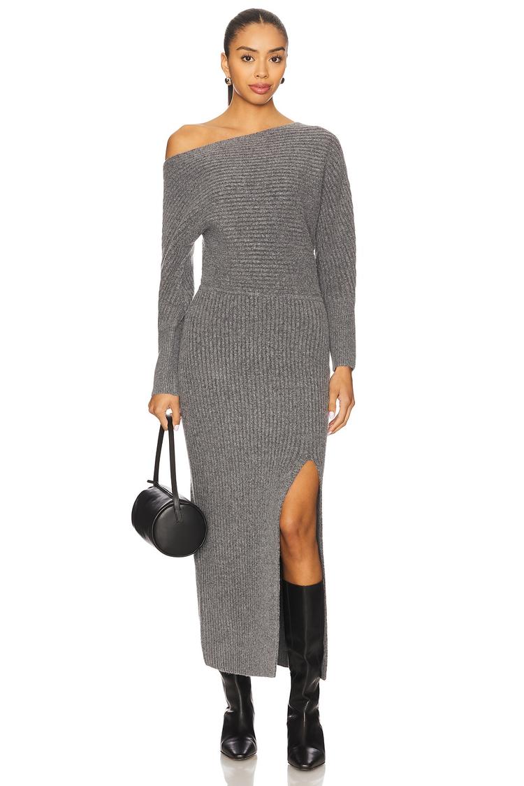 A sleek gray knit sheath silhouette with an off-shoulder neckline and long sleeves offers a modern minimalist vibe. The midi length and fitted shape enhance elegance while a side slit adds subtle allure. Crafted from a blend of acrylic, nylon, and spandex, this sweater dress delivers cozy stretch perfect for autumn and winter wear. Ideal for casual outings, date nights, or stylish brunches, it combines comfort with chic sophistication effortlessly.
