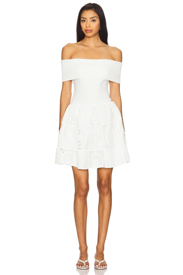 Softly structured with an off-shoulder neckline and wide strap styling, this mini dress features a fitted knit bodice paired with a cotton linen blend embroidered skirt. The clean hemline and subtle embroidery add a refined yet minimalist touch. Practical side pockets enhance its modern charm. Ideal for spring and summer occasions, this classic silhouette shines at brunches, cocktail parties, and wedding guest events, delivering effortless elegance in a midweight fabric blend.