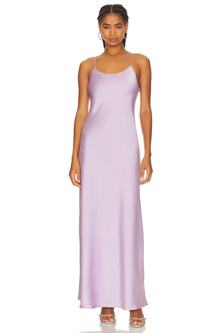Soft satin in a shimmering lilac hue shapes a sleek slip dress with a maxi length and a slim fit that flatters the figure. The U-neckline and delicate spaghetti straps lead to an elegant criss-cross back with a tie closure, adding a subtle touch of sophistication. Fully lined and crafted from a viscose blend, this dress is perfect for spring and summer evenings. Ideal for cocktail parties, date nights, and nights out, it combines minimalist charm with timeless elegance for versatile wear.