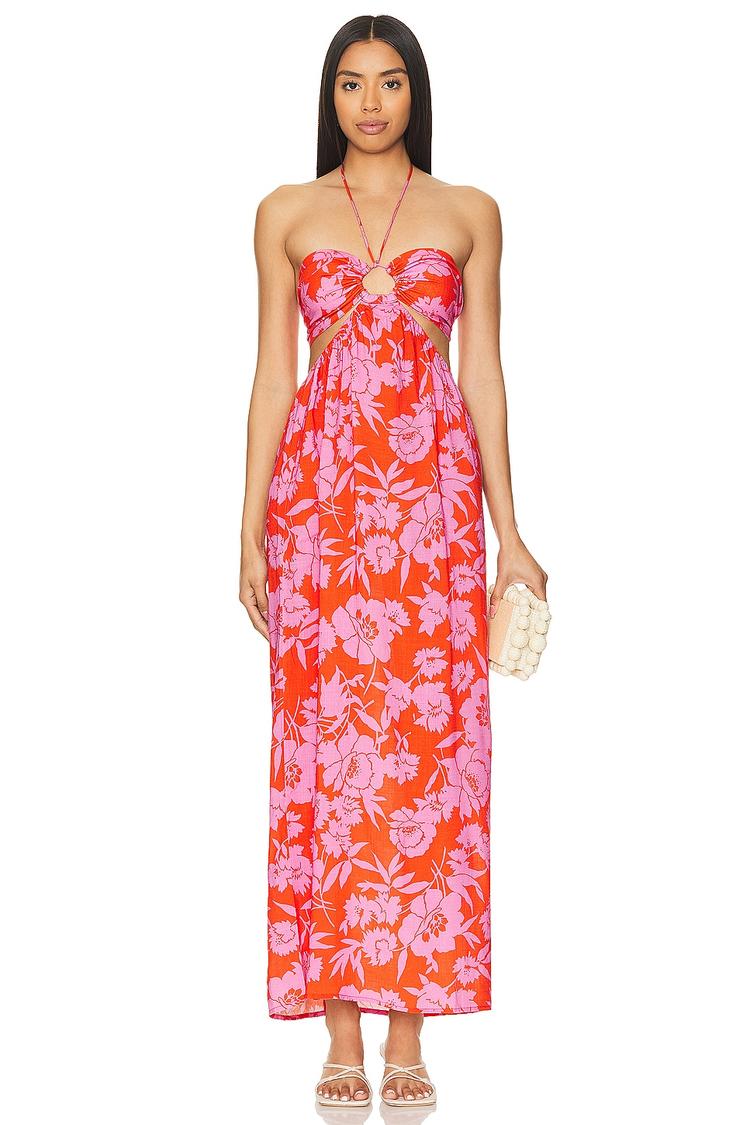 Bright coral and dusty pink floral prints bring a lively bohemian spirit to this relaxed-fit slip dress. Crafted from soft rayon, it features a sweetheart neckline and strapless styling with a tie-back closure that enhances its airy, summery feel. The midi length with a clean hemline offers versatile elegance perfect for casual brunches, vacation days, or romantic date nights. This partially lined midi dress blends comfort with feminine charm, making it an ideal piece for warm-weather occasions.