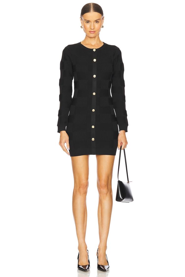 Gold button details accentuate the sleek matte black knit fabric of this fitted mini sweater dress, creating a modern yet classic silhouette. Featuring a round neckline and long regular sleeves, the Jones Mini Dress offers cozy autumn and winter style perfect for casual outings, brunches, or night outs. The clean hemline and pull-on styling deliver effortless sophistication, making it an ideal choice for chic everyday wear or date nights.
