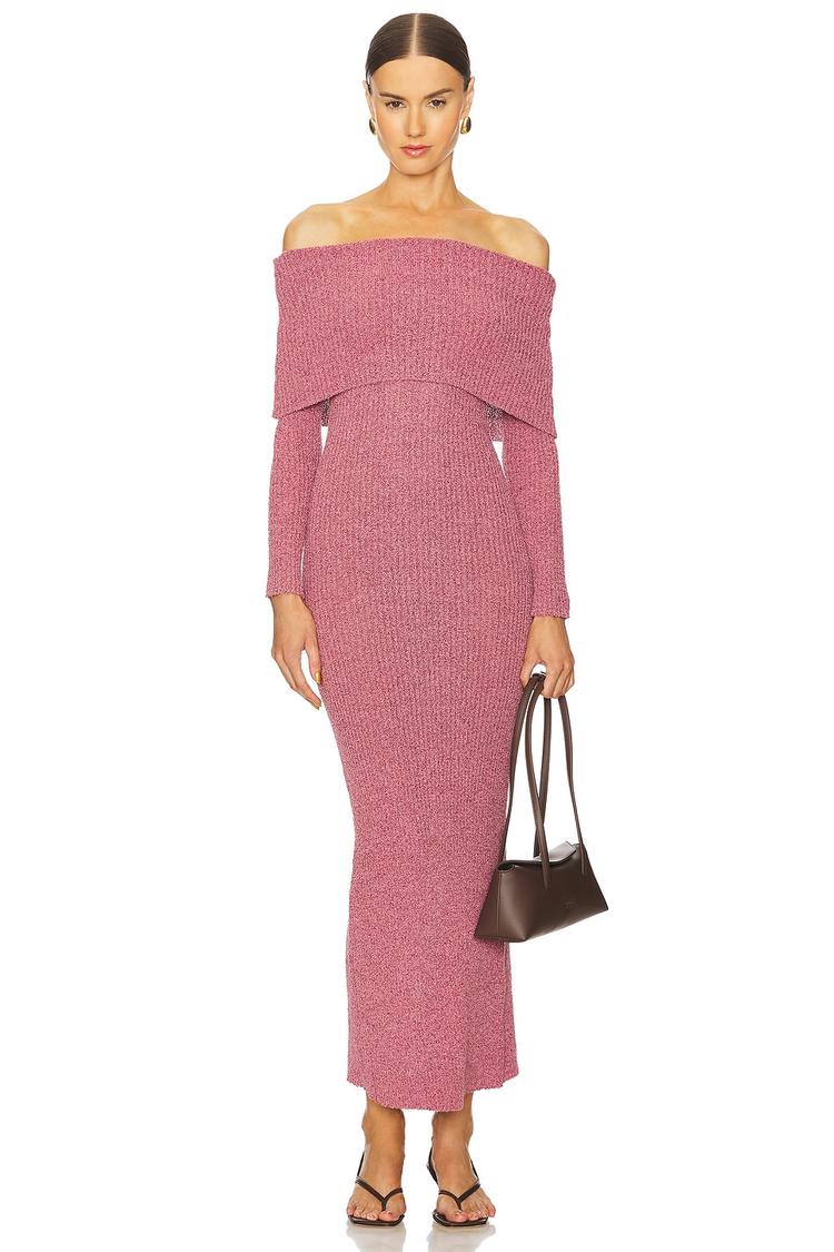 Soft knit fabric shapes a fitted sheath silhouette with an elegant off-shoulder neckline and long sleeves, creating a graceful look for cooler seasons. The maxi length and back slit add subtle movement and sophistication, while the pull-on style ensures easy wear. This dusty rose dress pairs perfectly with heels for date nights, cocktail events, or stylish evenings out. Its classic design and midweight blend of acrylic, rayon, and polyester make it a versatile and chic choice for autumn and winter wardrobes.