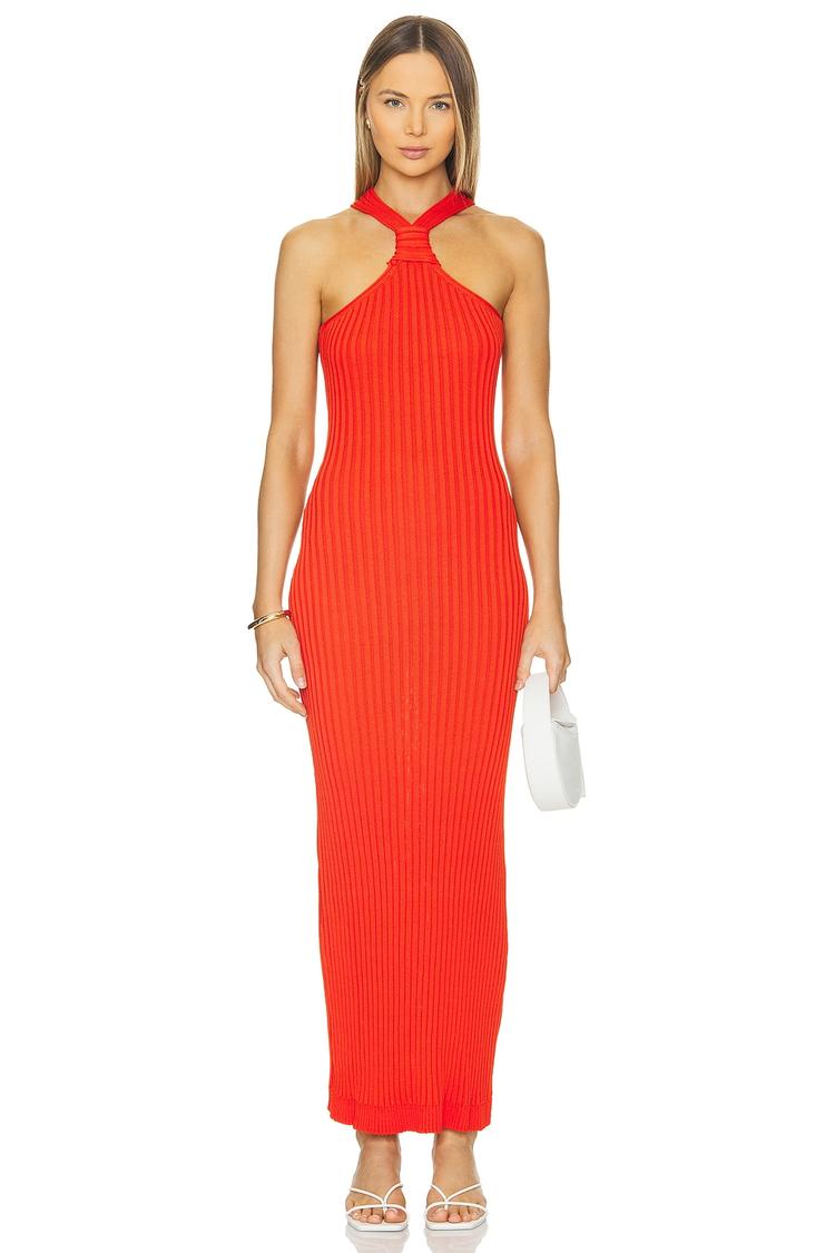 A vibrant bright red ribbed knit sheath dress with a sleek halter neckline and sleeveless styling offers a fitted silhouette that gracefully extends to a maxi length with a clean hemline. Crafted from a viscose and nylon blend, it provides both comfort and subtle stretch. This elegant and minimalist piece is perfect for spring through autumn evenings, ideal for cocktail parties, night outs, or date nights. Its simple pull-on slip-on design makes it an effortless yet striking addition to any wardrobe.