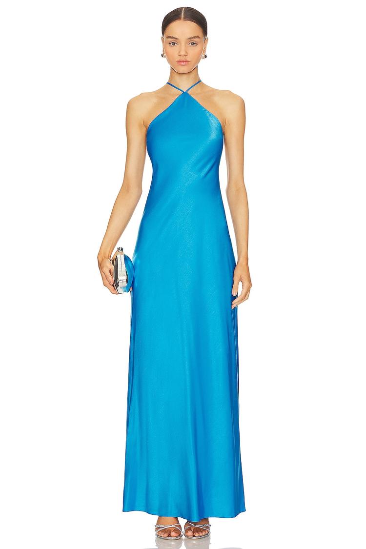 Bright blue satin fabric drapes effortlessly in this slim-fit slip dress, featuring a halter neckline that elegantly frames the shoulders. The back showcases a striking lace-up tie-back closure that adds a modern, sexy touch to the design. Falling to a flattering midi length with a clean hemline, this fully lined dress blends comfort with sophistication. Ideal for cocktail parties, date nights, and evening outings, its smooth polyester-rayon-spandex blend ensures a comfortable yet polished look for spring and summer events.