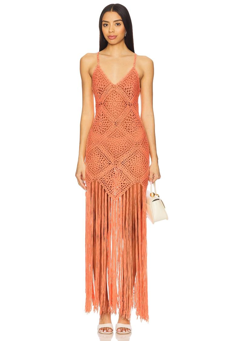 Delicately crafted in open crochet, this matte orange maxi dress features a slim fit and a flattering V-neckline with spaghetti straps for a breezy summer look. The fringed hemline adds playful movement and texture, perfect for beachside vacations or casual brunches. The slip-on style ensures easy wear, while the sheer acrylic fabric lends a lightweight, breathable feel ideal for warm spring and summer days. Embrace effortless bohemian charm with this standout piece, designed to elevate your casual chic wardrobe for sunny outdoor events and laid-back getaways.