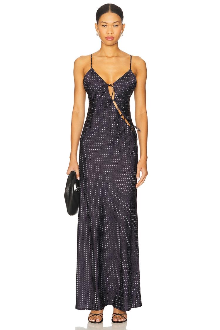 Lightweight satin fabric and a sleek silhouette define this maxi slip dress with delicate spaghetti straps and a flattering V-neckline. The slim fit hugs the body gracefully while the asymmetrical front tie closure adds a subtle, sexy detail. Perfect for date nights, cocktail events, or an elegant night out, this modern minimalist dress blends comfort and style effortlessly. Its timeless black base with white polka dots brings playful charm to your evening wardrobe during spring, summer, or autumn.