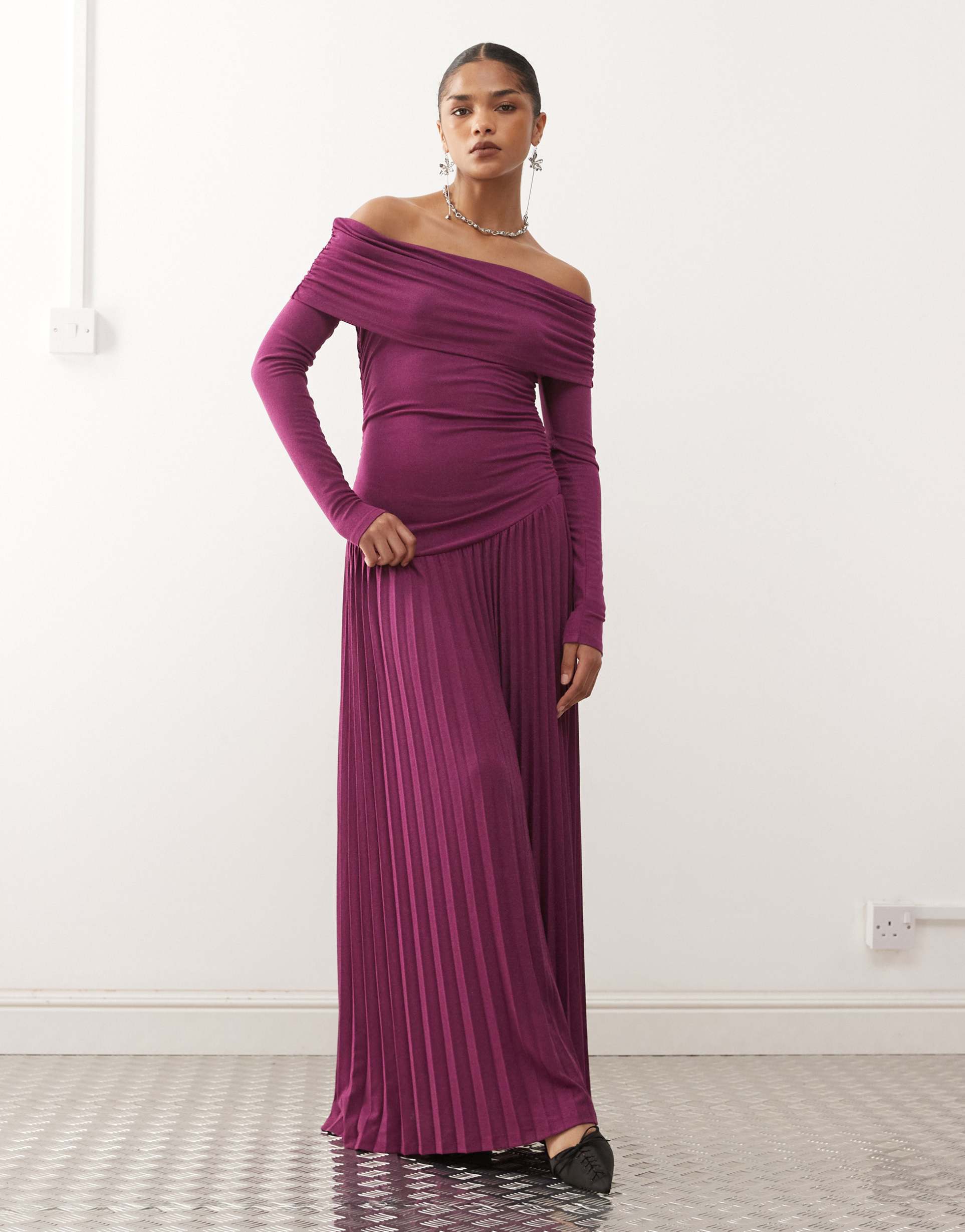 LIONESS FIELD OF DREAMS LONG SLEEVE FOLDOVER BARDOT RUCHED DROP WAIST PLEATED MAXI DRESS IN PLUM