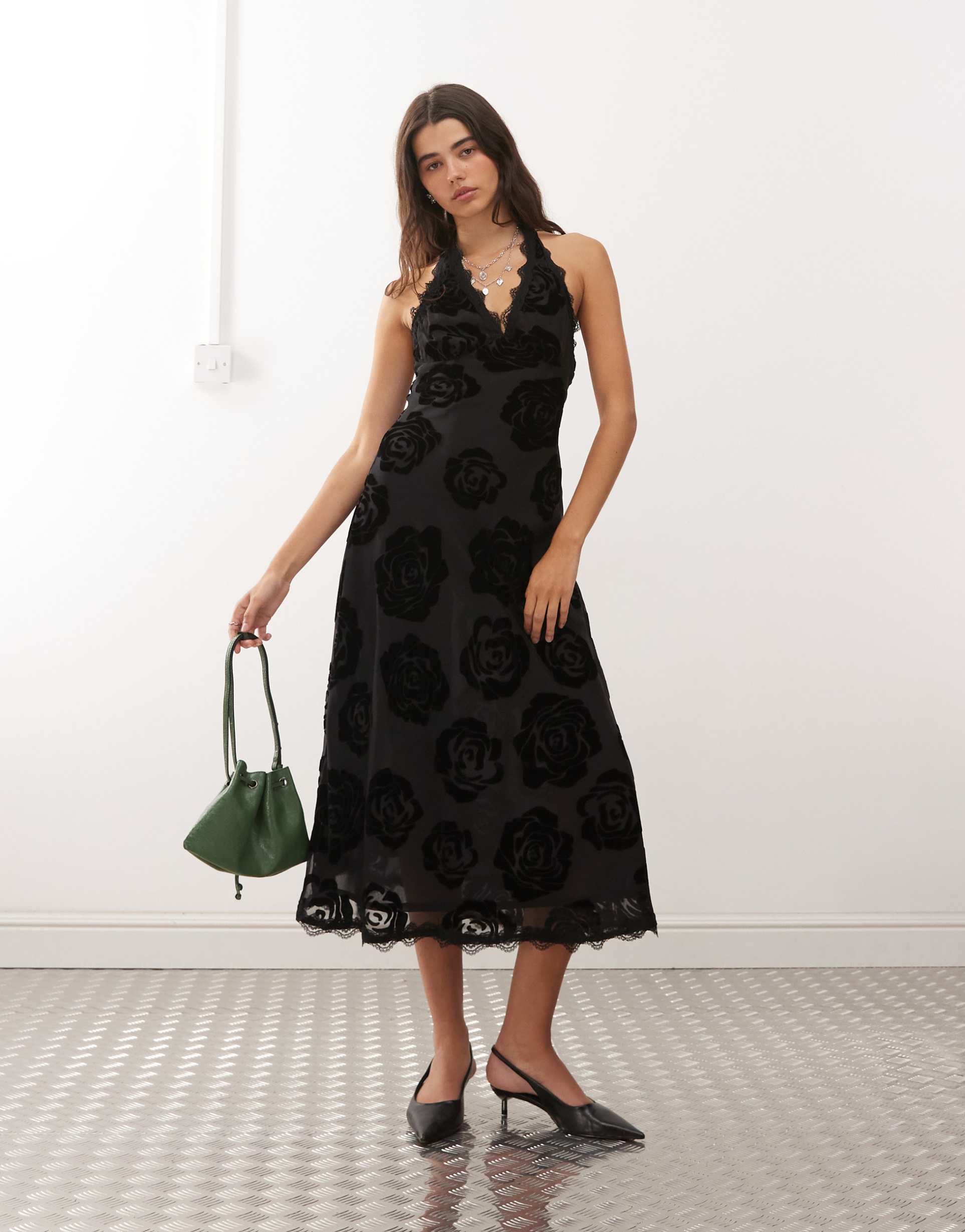 Softly flowing viscose and nylon blend fabric lends this halterneck slip dress an elegant, modern edge. The regular fit skims the body gracefully, featuring an open back with tie and zip-back fastenings for a flattering silhouette. Delicate black lace trim adorns the bodice and hem, complementing the subtle black floral devore pattern throughout. Its midi length and sleeveless design make it a versatile choice for date nights, cocktail parties, and stylish evening outings.