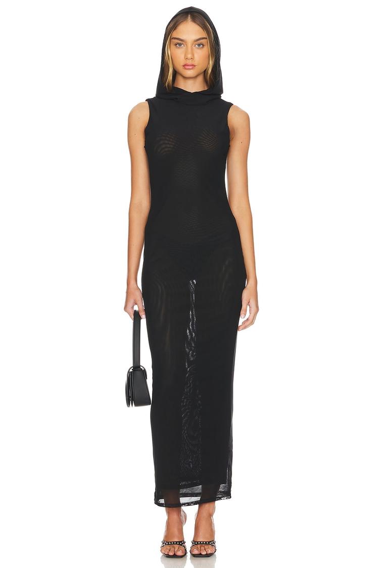 A sleek matte black column maxi dress crafted from semi-sheer mesh polyester offers a figure-skimming slim fit with a high neckline and sleeveless styling. The clean hemline complements the modern elegance of this pull-on style, featuring a unique attached hood for an unexpected twist. Fully lined for comfort and versatile for all seasons, this dress is ideal for cocktail parties, night outs, or date nights where you want to make a subtle yet striking statement.