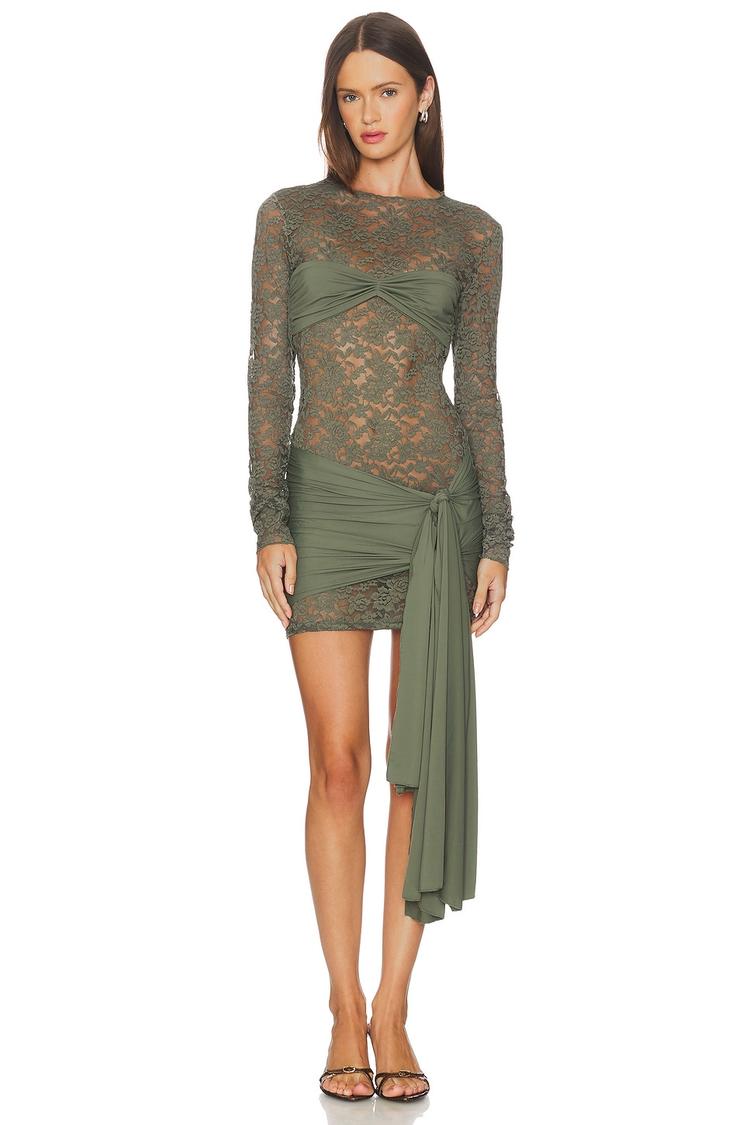 Semi-sheer lace meets a sleek jersey overlay in this modern, olive mini dress that hugs the body with a tight, bodycon fit. Featuring long sleeves and a classic round neckline, the dress is detailed with ruching along the front and back skirt, creating an alluring asymmetric hemline. Crafted from a nylon-elastane blend, this pull-on style offers stretch and comfort while maintaining a sexy, trendy vibe. Perfect for cocktail parties, night outs, or date nights, this dress combines edgy sheer panels with flattering ruching for a standout look.