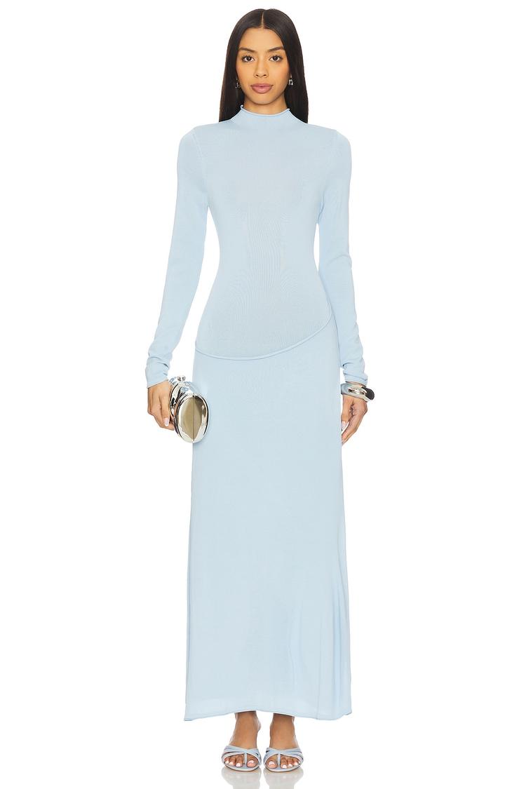 Soft knit fabric in a light blue hue shapes a sleek column silhouette with a maxi length that skims the ankles. The fitted cut, long regular sleeves, and modest mock neck create an elegant, minimalist vibe perfect for cocktail evenings, date nights, or refined night outs. Crafted from a lightweight viscose and nylon blend, this pullover maxi dress offers all-weather versatility and sophisticated comfort without any closures or embellishments, emphasizing clean lines and subtle style.
