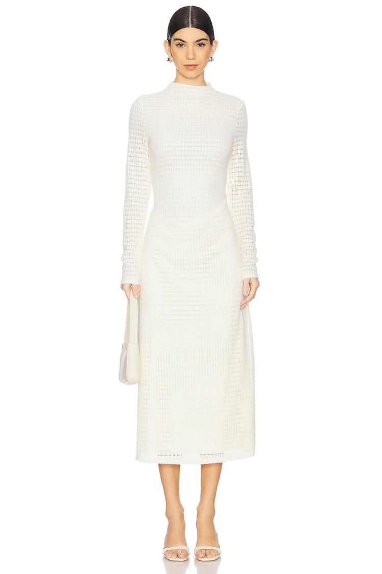 A sleek midi sheath silhouette crafted in a layered knit fabric offers a fitted, elegant look with a high neckline and long sleeves. The off-white hue and clean hemline emphasize minimalist sophistication, while the semi-sheer nylon and elastane blend adds subtle texture and stretch. Ideal for autumn and winter gatherings, this refined piece transitions smoothly to spring occasions. Perfect for date nights, cocktail events, and stylish night outs, its pull-on styling ensures effortless wearability with a modern, chic appeal.