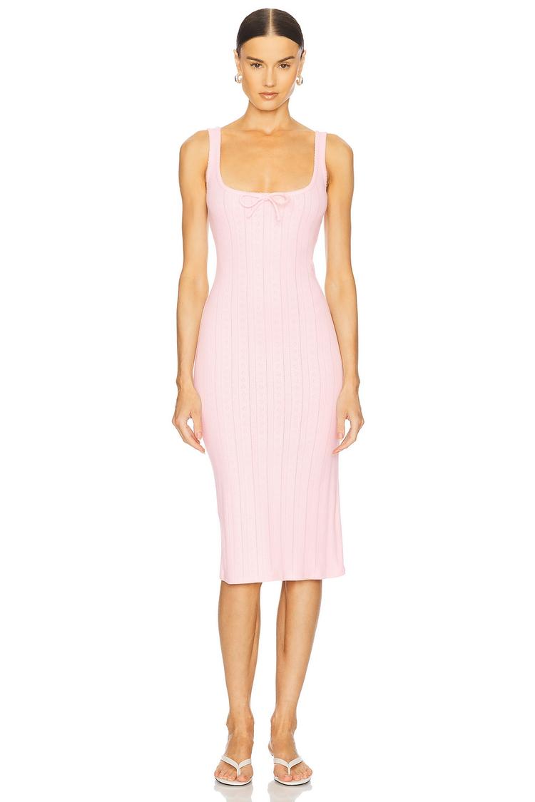 Soft pink knit fabric with delicate pointelle texture shapes this fitted sheath silhouette, creating an elegant midi dress ideal for spring and summer days. The scoop neckline and back enhance its minimalist appeal, while the tonal bow detail at the bodice adds a subtle feminine touch. Designed with wide straps and a clean hemline, this slip-on dress offers both comfort and style. Perfect for casual outings, brunch dates, or relaxed date nights, its cotton-polyester blend ensures breathable wearability and easy care.