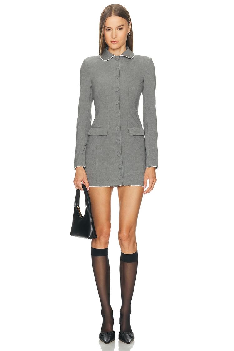A sleek mini blazer dress crafted from a smooth polyester-viscose blend offers a fitted silhouette that enhances your shape. Featuring a classic Peter Pan collar and long regular sleeves, this matte gray piece is perfect for workwear, business casual events, or stylish cocktail and date nights. The front button closure adds a refined touch, while the clean hemline emphasizes its polished appeal. Versatile and elegant, this dress blends modern sophistication with timeless style for seamless day-to-night transitions.