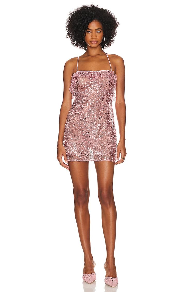 Shimmering sequins cover this dusty rose mini slip dress, crafted from sheer mesh polyester for a bold, see-through effect. Featuring a straight neckline and delicate spaghetti straps that tie at the back, this bodycon dress offers a sleek, fitted silhouette perfect for cocktail evenings, night outs, or date nights. The hidden side zipper ensures a smooth fit while the fully lined construction adds comfort. Its clean hemline and strappy back detail create an effortlessly sexy and trendy look that shines under the lights.