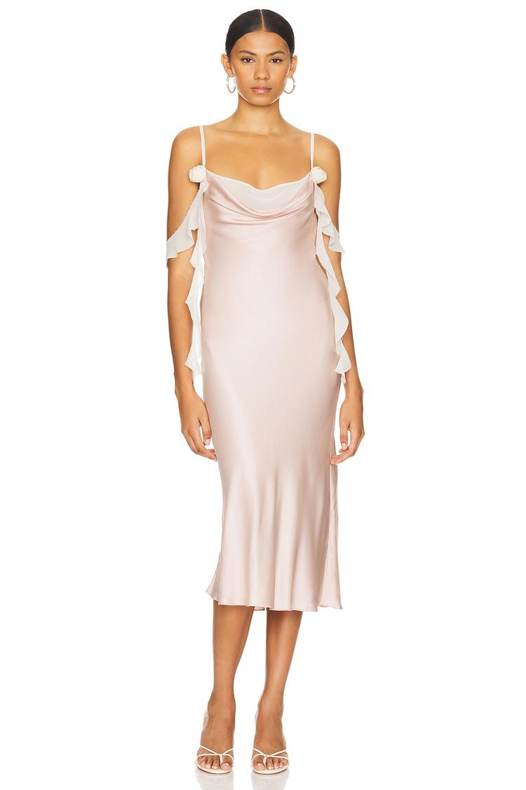 Soft shimmer blush satin fabric shapes a sleek slip dress with a flattering cowl neckline and a slim fit that skims the body. Adjustable shoulder straps adorned with delicate rosette and draped ruffle accents create a romantic cold-shoulder sleeve effect. The midi length and clean hemline add to its elegant silhouette, perfect for spring and summer evenings. This sophisticated style is ideal for cocktail parties, date nights, or girls' night outs, combining minimalist design with subtle feminine details and a hidden side zipper for a seamless finish.