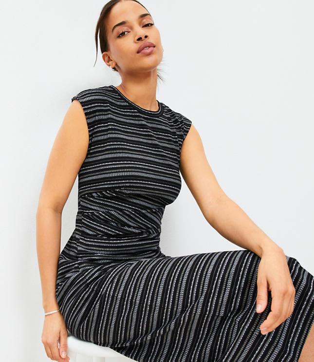Soft knit fabric and a striped pattern define this slim-fit midi dress designed with a round neck and sleeveless muscle tee style. The ruched side detail adds flattering shape and visual interest, while the slit hem enhances movement and appeal. Versatile for casual days, brunch dates, or relaxed evenings, this dress combines minimalist style with effortless comfort. The midi length and covered back complete its modern, chic look suitable for all seasons.