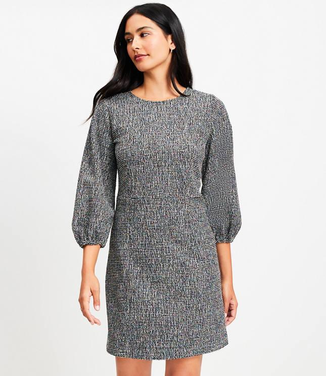 Soft knit tweed fabric in a matte gray hue shapes this shift mini dress with a flattering regular fit. The round neckline and three-quarter blouson sleeves with elastic cuffs add elegant volume and modern flair. An edgy exposed back zipper closure enhances the clean-lined silhouette, making it perfect for autumn and winter. This versatile dress suits business casual settings, workwear, or stylish date nights, combining comfort and chic sophistication with ease.