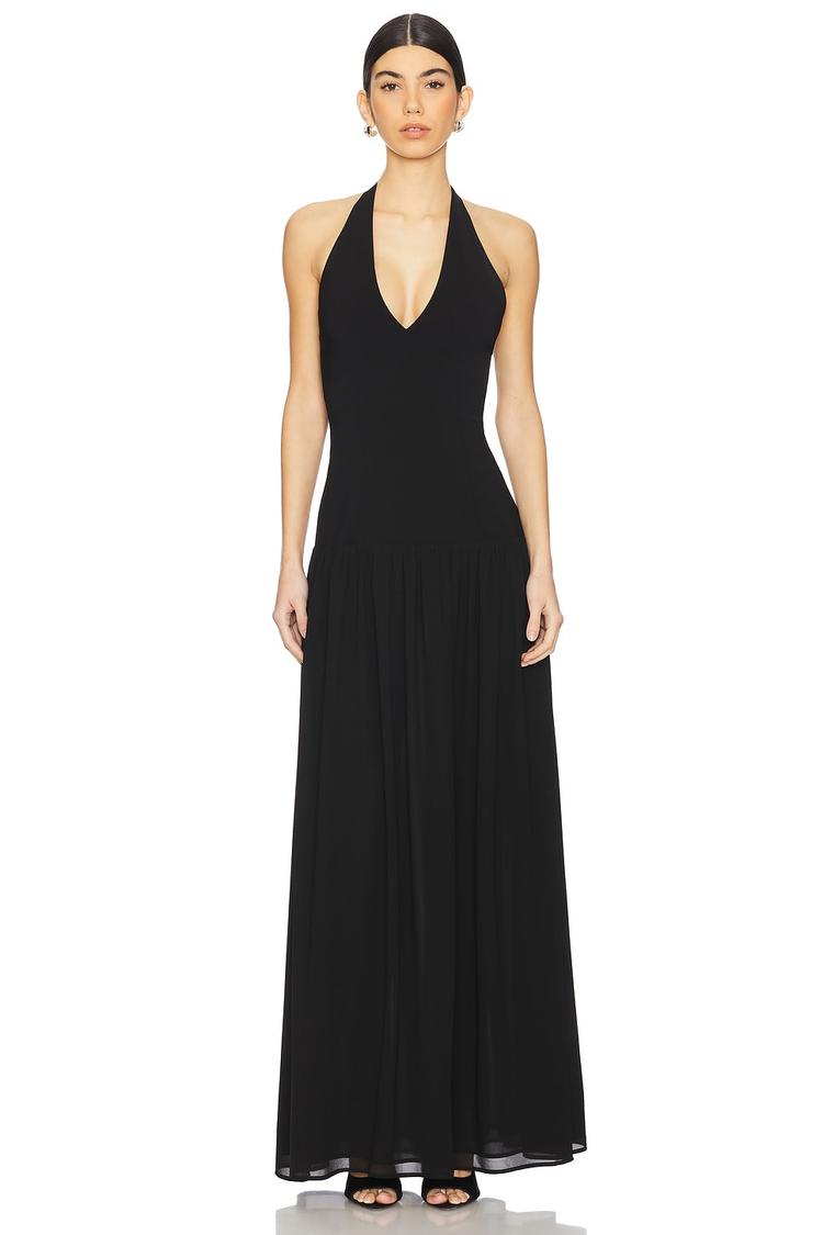 A sleek matte black column gown with a halter neck and plunging V-neckline, this maxi dress features a fitted silhouette that flatters the figure with a sophisticated drop waist design. The open back adds an alluring touch, while the clean hemline creates an elegant finish. Crafted from a comfortable polyester-elastane blend with full lining, it suits formal occasions, cocktail parties, and wedding guests seeking timeless elegance. Its versatile style ensures you stay chic and confident across seasons and events.