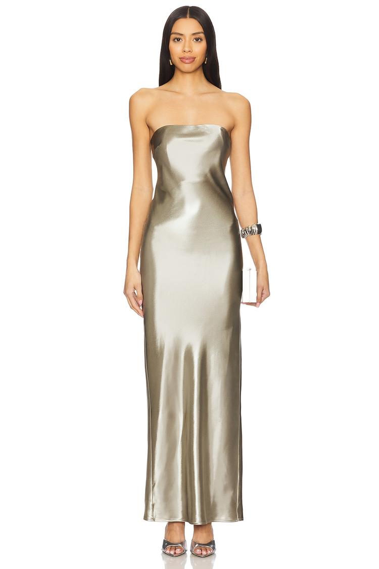A sleek metallic taupe satin column silhouette defines this strapless maxi dress, tailored for a fitted look that elegantly skims the body. Featuring a straight neckline and a concealed back zipper with hook and eye closure, this dress exudes classic sophistication and sexy appeal. Fully lined for comfort and crafted from a luxurious blend of polyester, nylon, elastane, and satin, it suits a variety of occasions such as cocktail parties, date nights, and evening outings. The clean hemline completes its refined finish, making it a timeless choice for all-weather wear.
