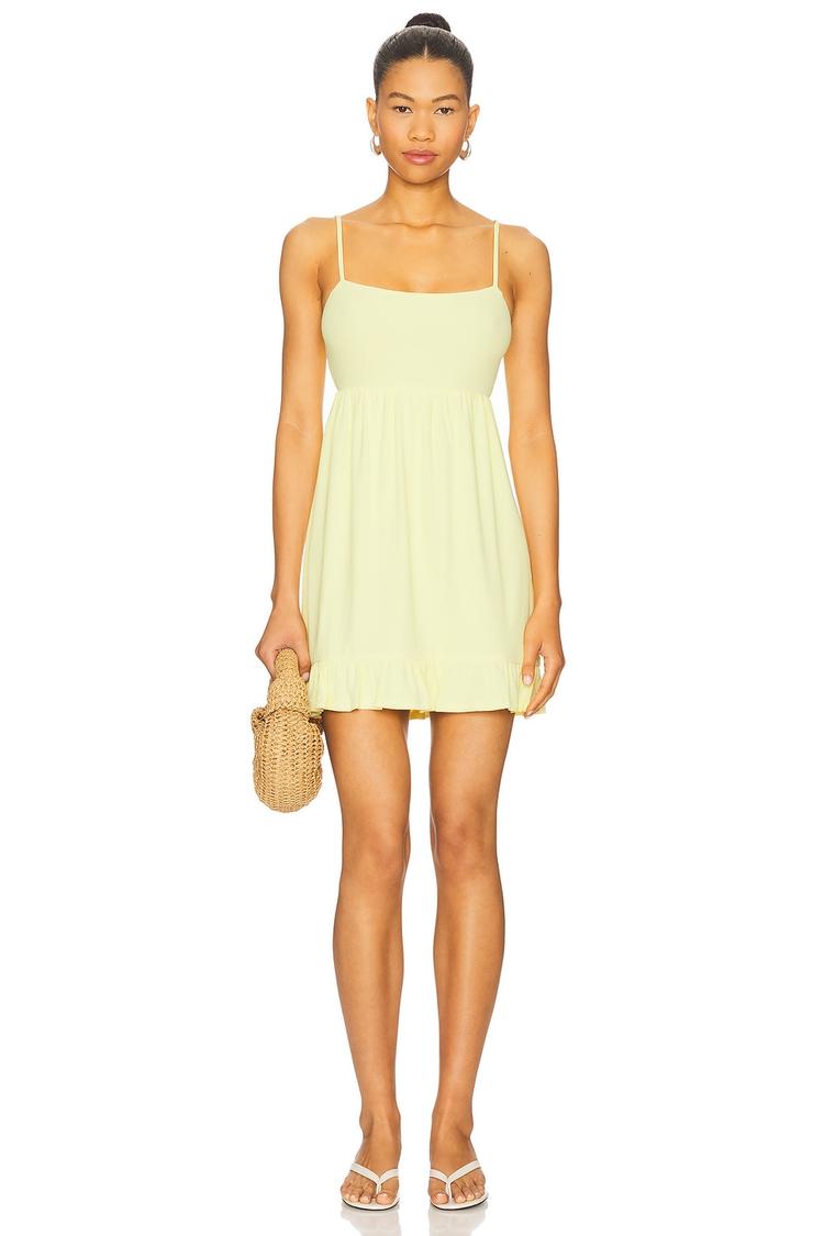 Soft ribbed fabric and a breezy babydoll silhouette create an effortlessly chic mini dress perfect for warm days. The square neckline and adjustable spaghetti straps enhance comfort and style, while the open back with a tie-up closure adds a playful touch. Crafted from a polyester-elastane blend, this matte light yellow dress offers a flattering loose fit ideal for casual outings, brunches, or date nights. Its clean hemline and fully lined construction ensure a polished look with easy pull-on wearability.