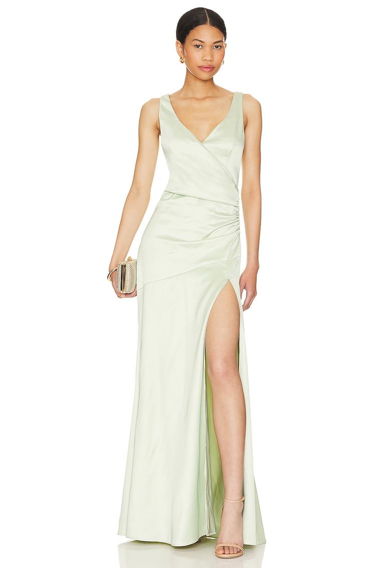 Soft matte light green satin fabric with elegant ruching and a daring side slit gives this column wrap gown a sleek, figure-flattering silhouette. The sleeveless design and surplice neckline create a timeless, sophisticated look perfect for formal occasions, cocktail parties, or romantic date nights. A hidden side zipper closure ensures a smooth fit, while the clean hemline adds to its polished charm. Crafted from a polyester satin blend, this maxi gown combines comfort with luxury for versatile all-weather wear.