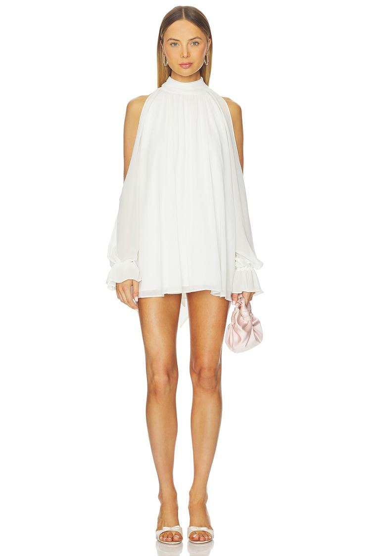 Soft georgette fabric and a high neckline create an effortlessly elegant silhouette with this white mini shift dress. Featuring loose, flowy long sleeves with cold-shoulder cutouts and delicate ruffle details, this lightweight piece is ideal for spring and summer occasions like brunch, date nights, or a night out. Its pull-on style and fully lined construction combine comfort with refined simplicity, making it a versatile choice for modern, minimalist wardrobes seeking a chic yet relaxed vibe.