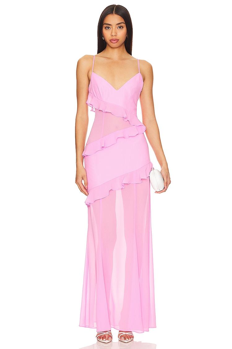 Delicate georgette fabric and a slim column silhouette come together in this pink maxi gown featuring a sweetheart neckline and plunging back. The lightweight, sheer panels and romantic ruffle trims enhance its fairy-esque charm, making it perfect for cocktail parties, semi-formal events, or elegant summer soirées. With spaghetti straps and a concealed side zipper, this gown balances comfort and sophistication effortlessly.