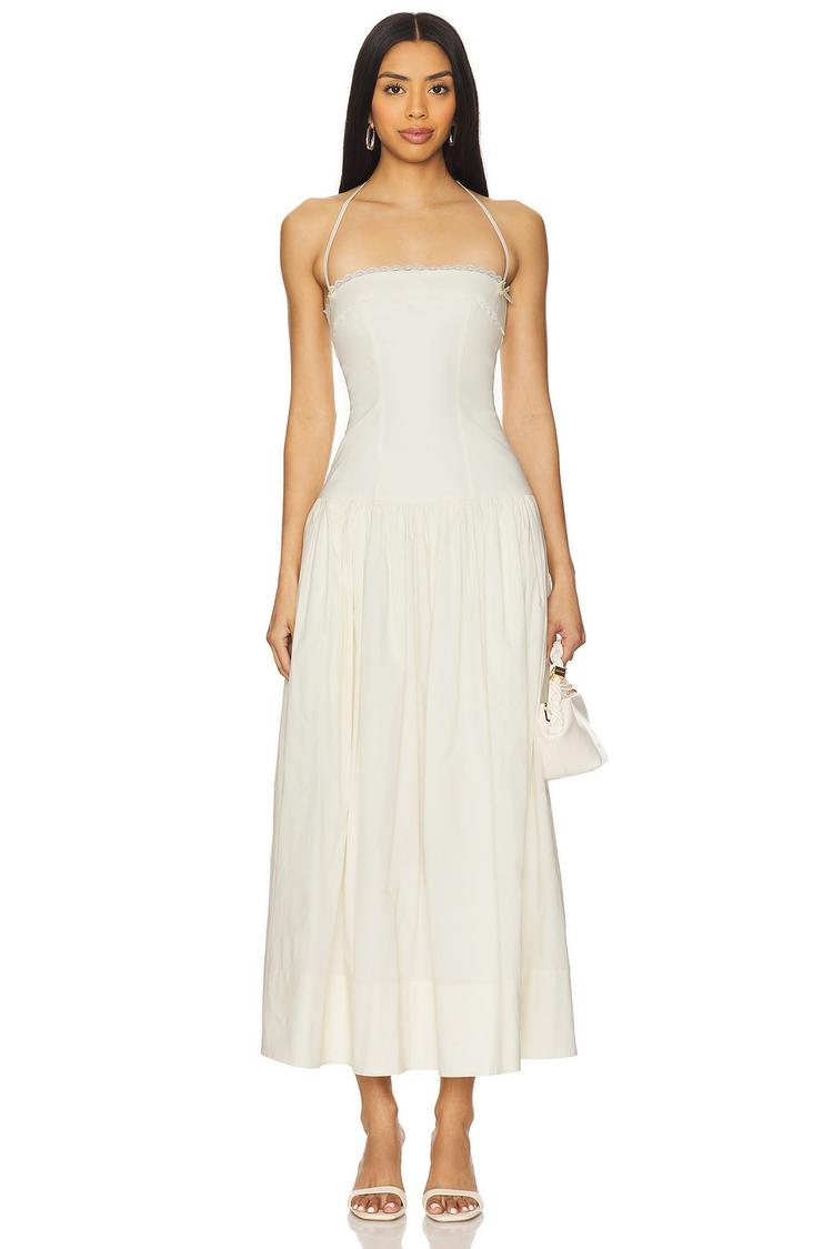 Lightweight cotton poplin with a hint of elastane shapes this A-line maxi dress, designed for a fitted silhouette and a straight neckline that frames the shoulders beautifully. The halterneck tie-back and hidden zipper ensure a secure fit, while delicate lace trim adds a romantic touch throughout. Side seam pockets blend practicality with style. Ideal for spring and summer days, this versatile dress transitions effortlessly from casual brunches and vacation strolls to date nights, combining comfort with timeless elegance.