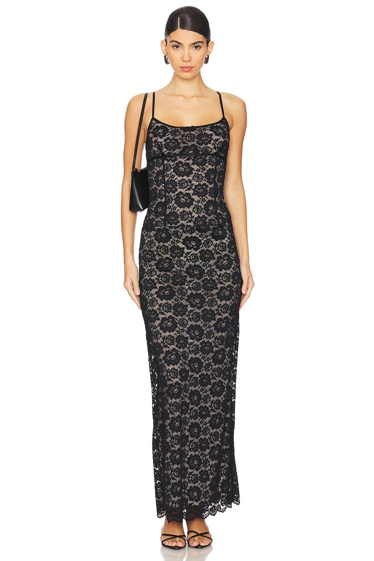 Delicate floral lace overlays a sleek black column silhouette with a straight neckline and adjustable spaghetti straps, creating a stunning maxi gown that's both modern and sexy. The slim fit accentuates the figure while the fully lined nylon-elastane fabric ensures comfort and ease of movement. A hidden side zipper closure adds a seamless finish to this elegant piece. Ideal for cocktail parties, night outs, or romantic date nights, this sheer gown combines sophistication with alluring design details for a memorable look.