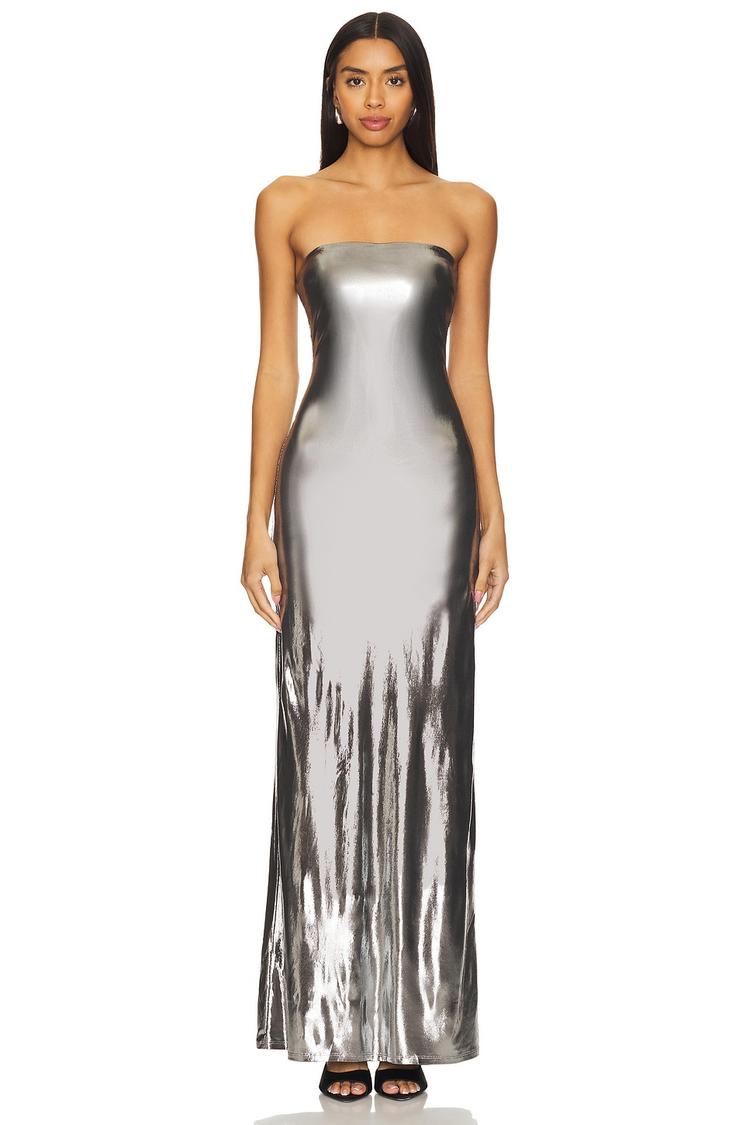 Shimmering metallic silver fabric sculpts a sleek column silhouette that flows elegantly to the floor in a maxi length. This strapless gown features a straight neckline and a fitted cut that highlights the natural curves, all crafted from lightweight polyester-elastane lame fabric for subtle stretch and comfort. The clean hemline and covered back add to the gown’s sophisticated modern aesthetic. Ideal for cocktail parties, formal events, galas, night outs, and date nights, it offers a polished and radiant look for special occasions.