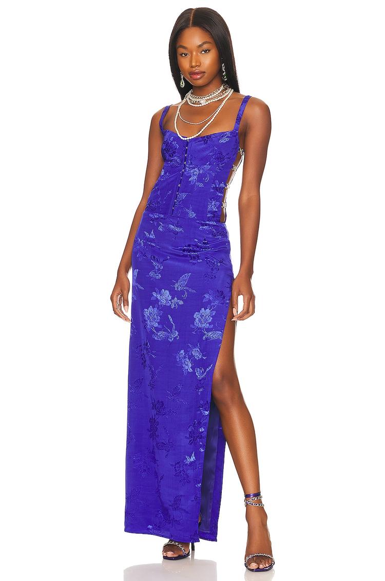 A striking column silhouette in matte blue with all-over floral patterning and a fitted bodice featuring a square neckline and delicate spaghetti straps. The gown's maxi length and side slit add an alluring touch, complemented by elegant gold chain accents at the side cut-outs. Crafted from a blend of viscose, rayon, polyester, and elastane, it offers both comfort and sophistication. Ideal for cocktail events, date nights, and formal occasions, this dress combines sexy detailing with timeless elegance for a standout look.