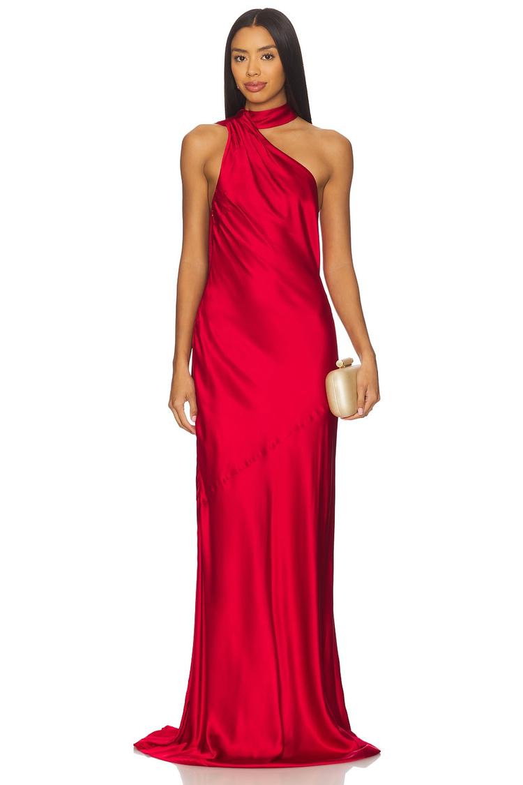 red draped gown