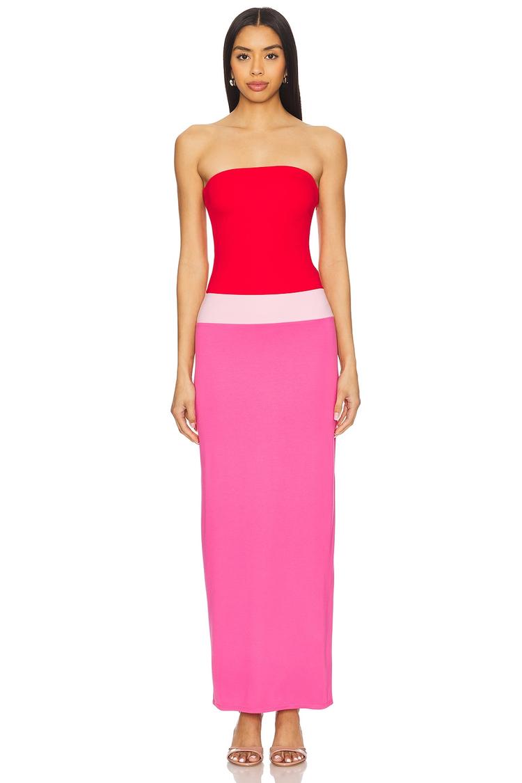 A striking color-blocked maxi dress features a fitted column silhouette in lightweight jersey fabric, blending cotton, nylon, and elastane for comfortable stretch. The strapless straight neckline is designed with a non-slip silicone lining to ensure a secure fit. Its clean hemline and hidden side zipper enhance the sleek look, making it a perfect choice for spring and summer evenings. Ideal for date nights, cocktail parties, or nights out, this modern and sexy dress balances bold color contrast with effortless comfort and style.