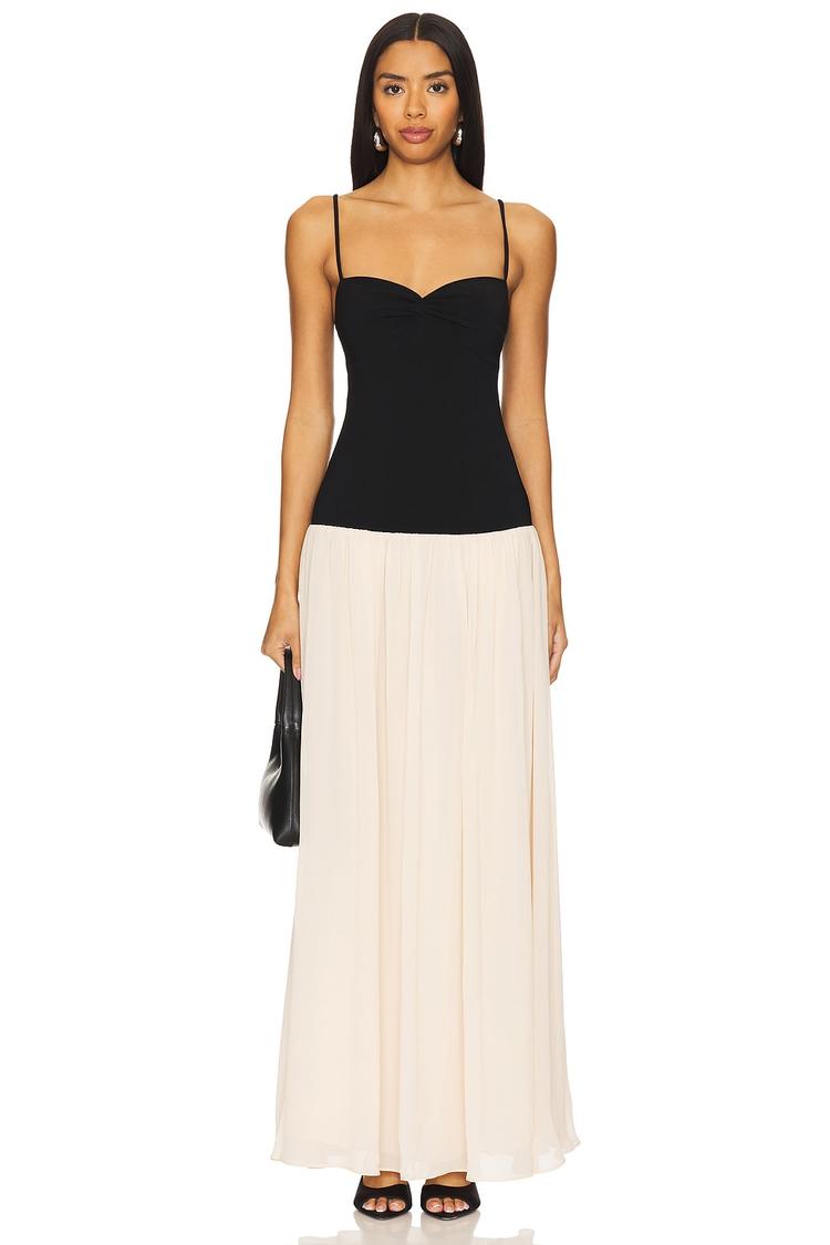 A sleek column silhouette defines this maxi gown featuring a fitted black bodice with elegant sweetheart neckline and delicate spaghetti straps. The cream skirt flows smoothly from the drop waist, crafted in midweight polyester-elastane blend for comfortable stretch and structure. Concealed back zipper closure and full lining ensure a polished finish. This versatile gown suits cocktail parties, formal events, and wedding guest occasions with timeless sophistication and classic charm.